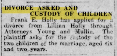 A day before my Great-grandpa’s 28th birthday he applied for a divorce and custody of his children. Frank’s six-year marriage to Lillian Farley produced my two Grand Aunts, Carrie, and Lucille. I did not have the pleasure to meet them, however, their experience and knowledge about Frank Holly gave me a genealogy boost.