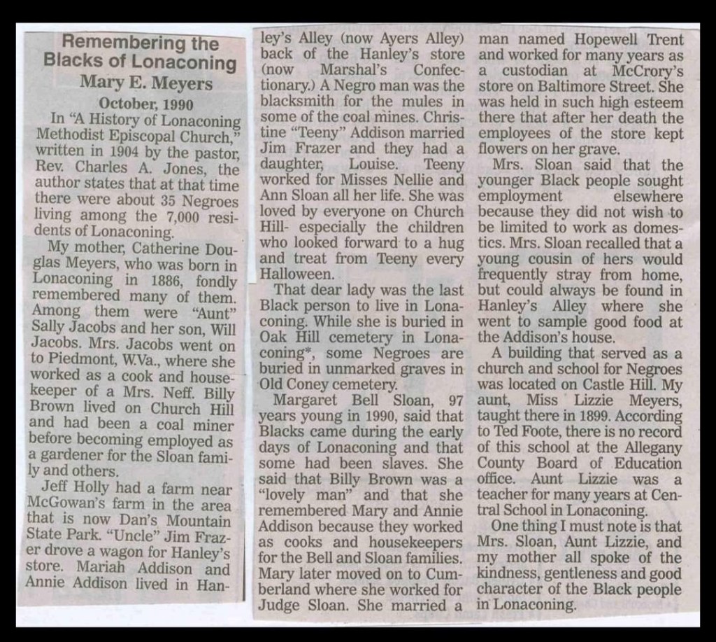 I didn’t know if Lonaconing was a person, place, or thing. My first thought was glass manufacturing. I discovered a clipped newspaper article titled, “Remembering the Blacks of Lonaconing.” The reporter interviewed an elderly person in the community. She recalled the only Black people living in their town. Lonaconing is one of the five cities/towns in Allegany County. Andy and I were both excited about my discovery. The write-up mentioned Frank’s Grandpa, Thomas “Jefferson” Holly.